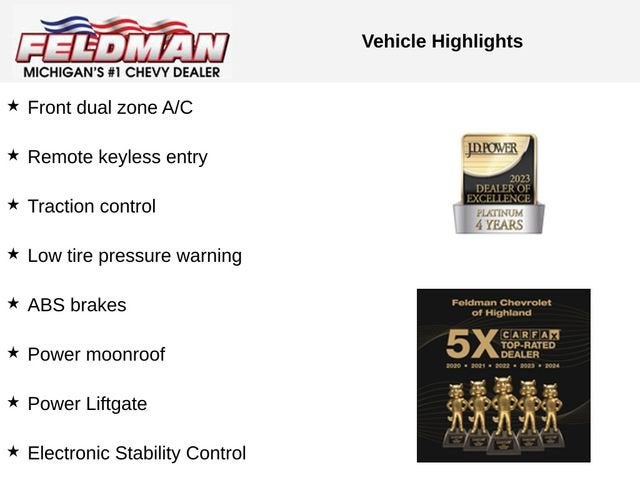 ABS brakes, Alloy wheels, Compass, Electronic Stability Control, Front dual zone A/C, Heated door mirrors, Heated Front Bucket Seats, Heated front seats, Illuminated entry, Low tire pressure warning, Power Liftgate, Power moonroof, Remote keyless entry, Traction control.