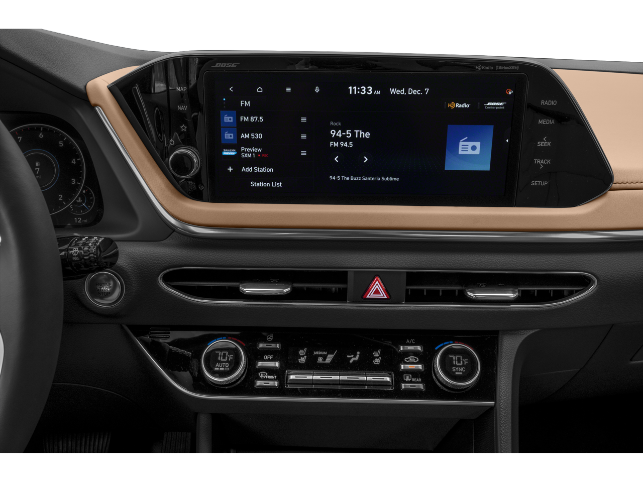 - Radio: AM/FM/MP3/HD/SiriusXM Display Audio w/Nav -inc: 10.25" color touchscreen, Bose premium audio w/12 speakers (1 center channel, 2 dash, 2 front tweeters, 4 door mounted, 2 rear mounted speakers plus 1 rear mounted subwoofer), dynamic voice recognition, integrated Bluetooth®, Blue Link connected car system, Apple CarPlay, Android Auto, USB, diversity antenna for navigation and HERE HD traffic
